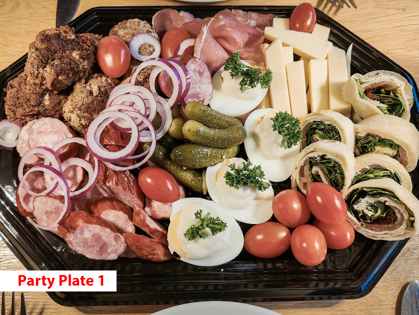 ----------------------------------------------------- Party Plate 1 - 26,00 € Polnische Räucherwurst, geräucherter-Schinken, Frikadellen, Zwiebelringe, Käse, Eier mit Mayonnaise, Wrap mit Lachs, kleine Tomaten, kleine Gewürzgurken. Gewicht ca. 1 kg. Empfohlen für 5-6 Personen
