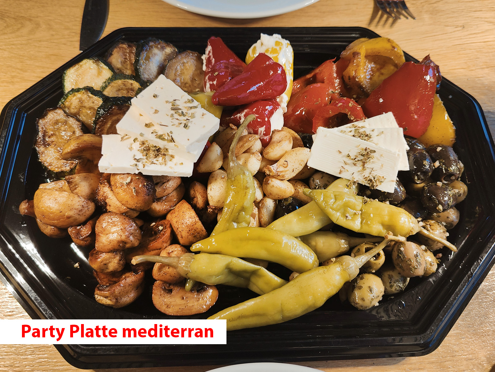 ----------------------------------------------------- Party Platte mediterran - 23,00 € Gebratene Champignons, Zucchini, gebratene Paprika, eingelegte Oliven, Peperoni, Fetakäse, gefüllte kleine Paprikas mit Frischkäse, Knoblauch gebraten Gewicht ca. 0,9 kg. Empfohlen für 5-6 Personen