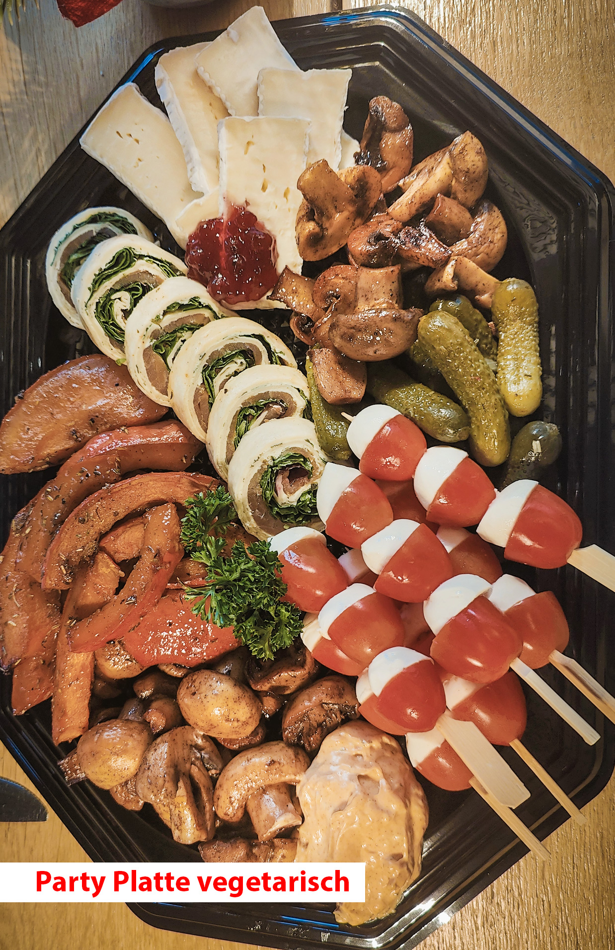 ----------------------------------------------------- Party Plate vegetarisch - 23,00 € Wrap-Röllchen mit Frischkäse und Wildkräutersalat, gebratene Champignonköpfe mit Knoblauchcreme, Tomaten-Mozzarellaspieße, Kürbissteaks, Camembert mit Preiselbeeren, Cornichons Gewicht ca. 0,9 kg. Empfohlen für 5-6 Personen